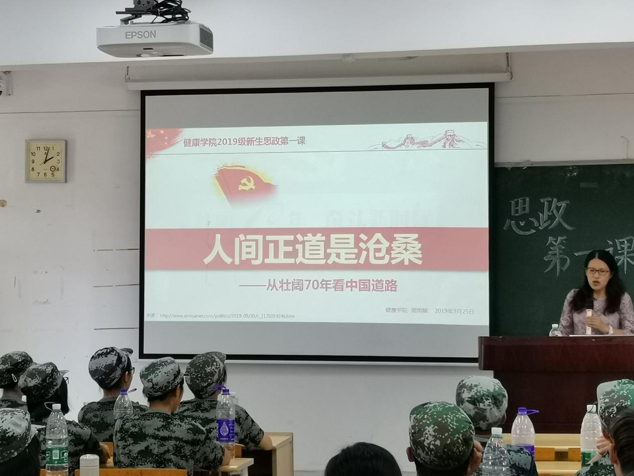“天若有情天亦老,人间正道是沧桑”,周书记的课堂以毛泽东主席的诗句开篇,向同学们介绍了中国特色社会主义道路的历史与发展进程。人民健康是民族昌盛和国家富强的一个重要标志,周书记着重介绍了新中国成立70年来,我国在健康领域取得的巨大进步。她说,衡量一个国家居民健康水平的三项主要指标是人均预期寿命、婴儿死亡率和孕产妇死亡率。我国的人均期望寿命已经从35岁提高到77岁,婴儿死亡率和孕产妇的死亡率大幅下降,主要健康指标优于中高收入国家的平均水平。国家持续加大对健康、科技、教育等的投入,人民生活水平不断提高。新中国70年从站起来、富起来到强起来的历程,使我们坚信,只要跟着中国共产党走,中国就有更光明的未来。